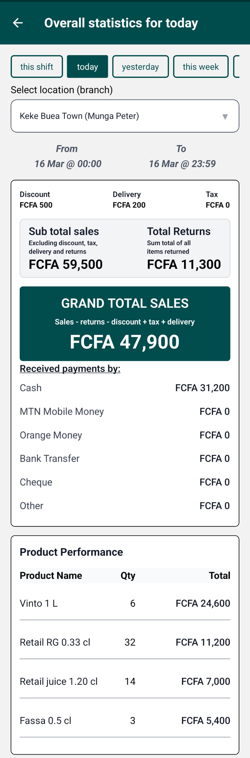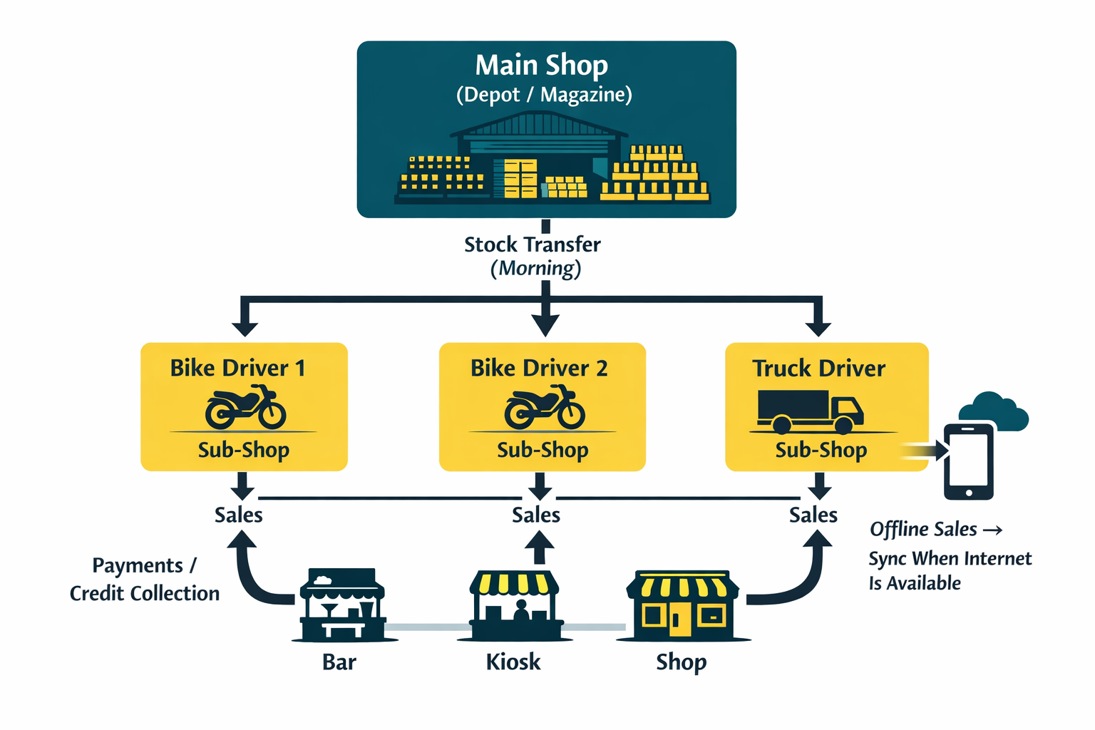 Each driver operates through their own sub‑shop inside TCPoS. Every crate transferred, every sale recorded, and every payment collected is linked to that specific driver. At the end of the day, there is no confusion about who sold what or who collected which payment.